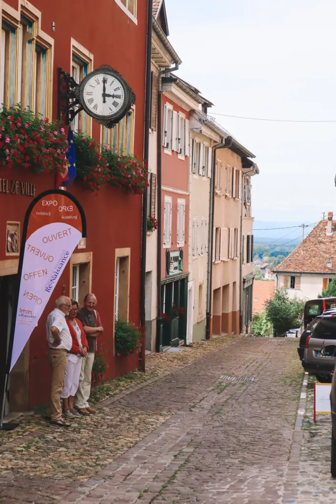 Helaas hebben wij geen mazzel met het weer en blijft er van het veelbelovende uitzicht weinig over. Maar er wacht iets anders moois op ons: de Route des vins d’Alsace. Tussen de bergen en de Rijn slingert over 170 kilometer de oudste wijnroute van Frankrijk. Langs pittoreske dorpjes, beroemde wijnsteden en mooie landschappen. Wij fietsen er maar een deel van, maar hebben geluk. Je fietst hier letterlijk door de wijngaarden en deze periode (eind augustus/begin september) is hét moment dat de druiven worden geoogst.