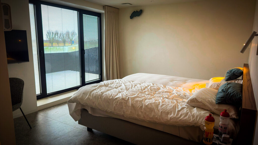In ons verblijf in Ledegem, bij Monte Marcella, kunnen we de dag nog eens doornemen. In de enorme gezamenlijke ruimte ontspannen we op de comfortabele banken. Het editen van de foto’s is al begonnen. We doen ons te goed aan een pasta gemaakt in de professionele keuken van het resort en ondertussen laten we de dag nog even voorbij komen. Als we later onze hoogtekamer betreden, dan snappen we wel waarom topsporters, wielerploegen en teams zich hier nestelen om zich voor te bereiden op de klassiekers. Want vanuit Ledegem, onder de rook van Kortrijk, ben je haast ideaal gepositioneerd voor het Vlaamse voorjaar. Vanaf hier ga je naar het westen en kom je op de Kemmel uit en kun je daarna via de Baneberg en de Monteberg zo door naar de gravelpaden. In Flanders fields is op een steenworp.
