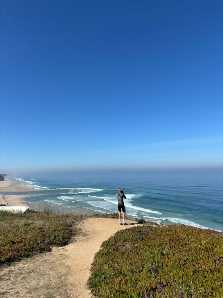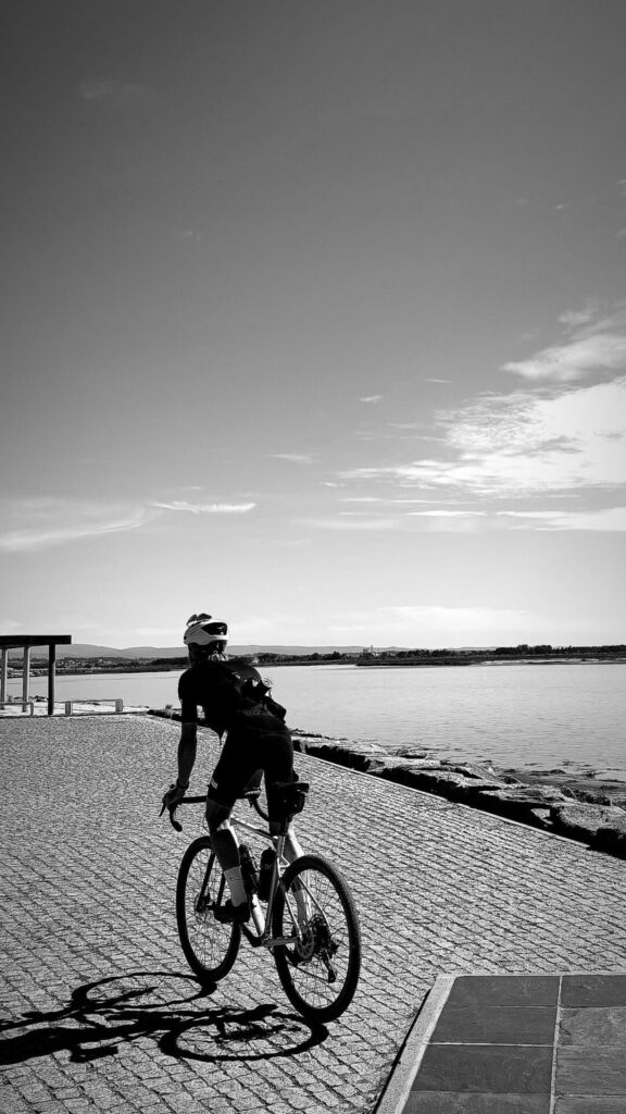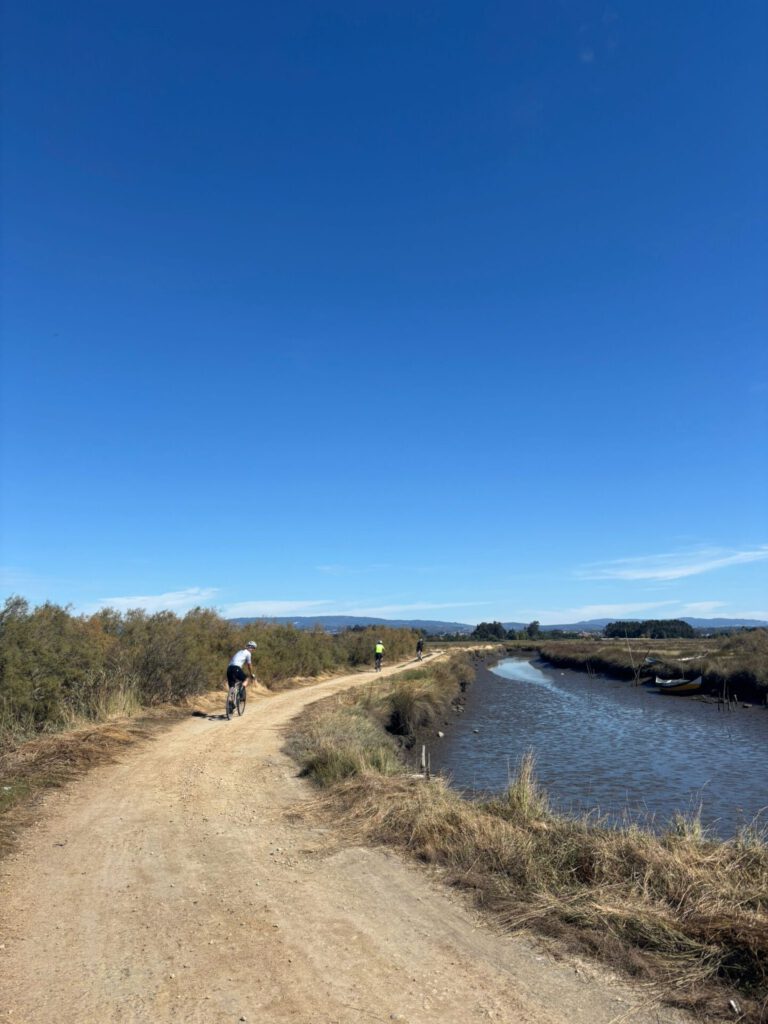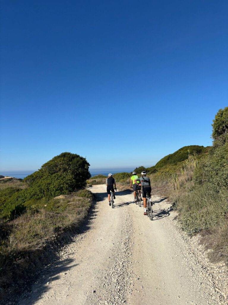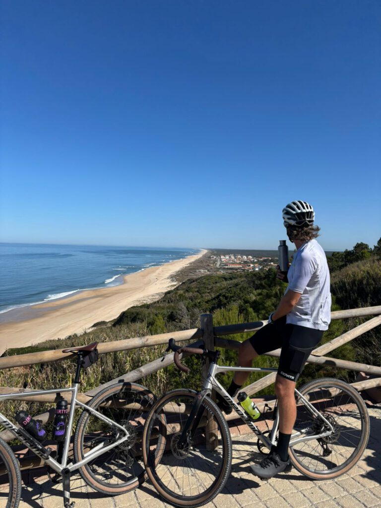 We vertrekken vroeg, de oceaan nog in de oren. De klim uit Nazaré hakt erin, en kort daarna volgt een pittige beklimming naar Pescarias, waar de benen branden maar het uitzicht over zee alles goedmaakt. Daarna wijken we af van de hoofdroute en volgen een gravelpad door roodbruine aarde. Het voelt alsof we door een schilderij rijden – aarde, lucht, zee en stilte. Ruben noemt het “het echte Portugal”: ruig, eenvoudig, vol kleur.