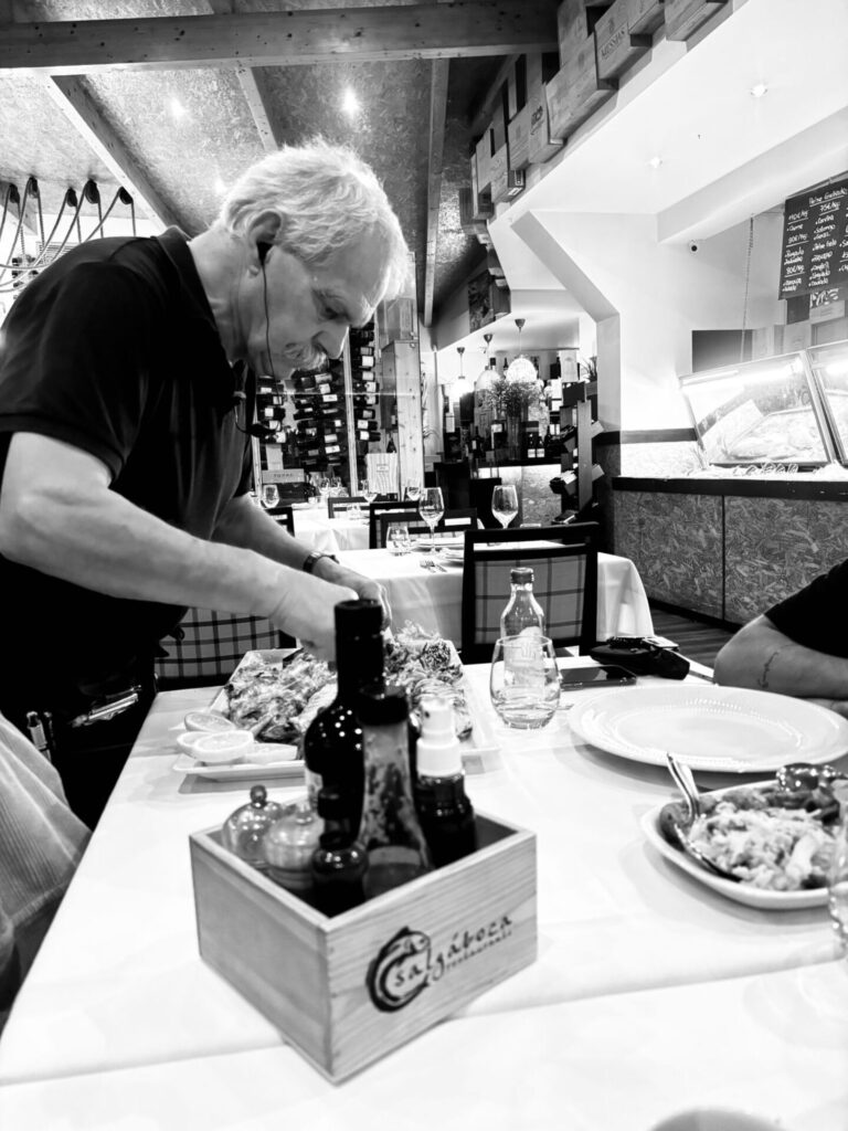 Langs de kust fietsen zonder vis te eten is bijna onmogelijk. Elke havenplaats heeft zijn eigen grill of marisqueira, waar sardientjes en zeebaars direct van de grill op tafel komen. In Praia de Mira schuiven we aan bij Salgaboca Restaurant, een sfeervol visrestaurant aan zee waar alle vis met een hengel wordt gevangen. De geur van houtskool en citroen hangt in de lucht. De ober met zijn indrukwekkende snor toont eerst de verse vis aan tafel, voordat hij na het grillen zorgvuldig voor ons de graatjes verwijdert. Buiten hoor je de golven breken terwijl de borden nog dampen. De vis is hier zo vers dat hij nog naar zout ruikt; eenvoud is het geheim van de Portugese keuken. Een bord gegrilde dourada, wat citroen en een glas Vinho Verde – meer heeft de dag niet nodig.